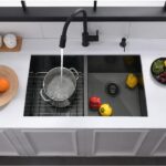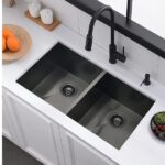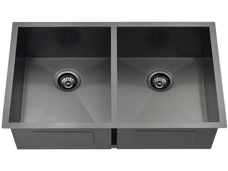 The 32 in x 18 in x 9 in black undermount double bowl sink features a sleek and functional design. With straight corners and luxury finish, it adds sophistication to any kitchen. Its high-quality construction ensures durability and style.