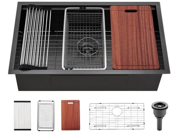 The 32 in x 19 in x 9 in black undermount single bowl Luxury kitchen sink – Workstation is a sleek and modern option for any kitchen. Made from high-quality materials, it offers excellent durability and wear resistance. Its undermount design allows for installation beneath the countertop, providing a cleaner and more streamlined look. This model features an integrated workstation, optimizing space and allowing you to perform tasks such as cutting, draining, and washing more efficiently. Its large capacity and luxurious black finish add a sophisticated and contemporary touch to your kitchen.