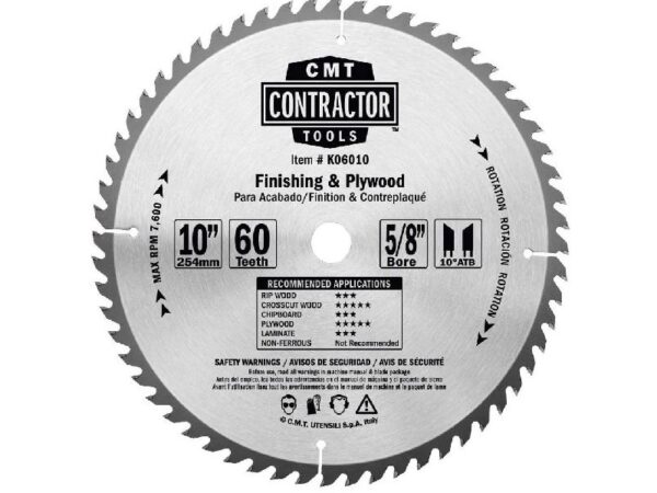 CMT K06010 ITK Contractor Finish & Plywood Saw Blade, 10 X 60 Teeth, 10° ATB With 5/8-Inch Bore