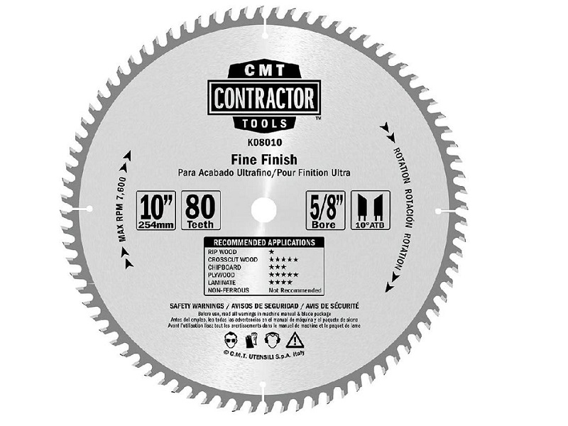 CMT K08010 ITK Contractor Finishing Saw Blade and 10 X 80 Teeth, 10-Degree ATB with 5/8-Inch Bore