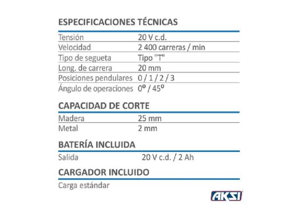 Sierra caladora inalámbrica 20V – 2 Ah línea Switch AKSI + batería + cargador – 196071